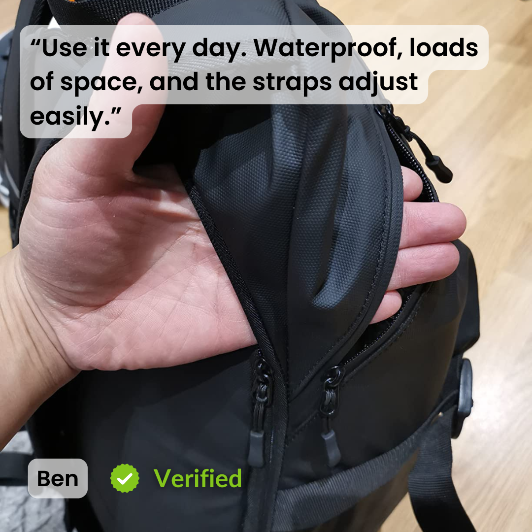 The zippers are waterproof and the material is highly water-resistant, keeping your gear dry in light to moderate rain.