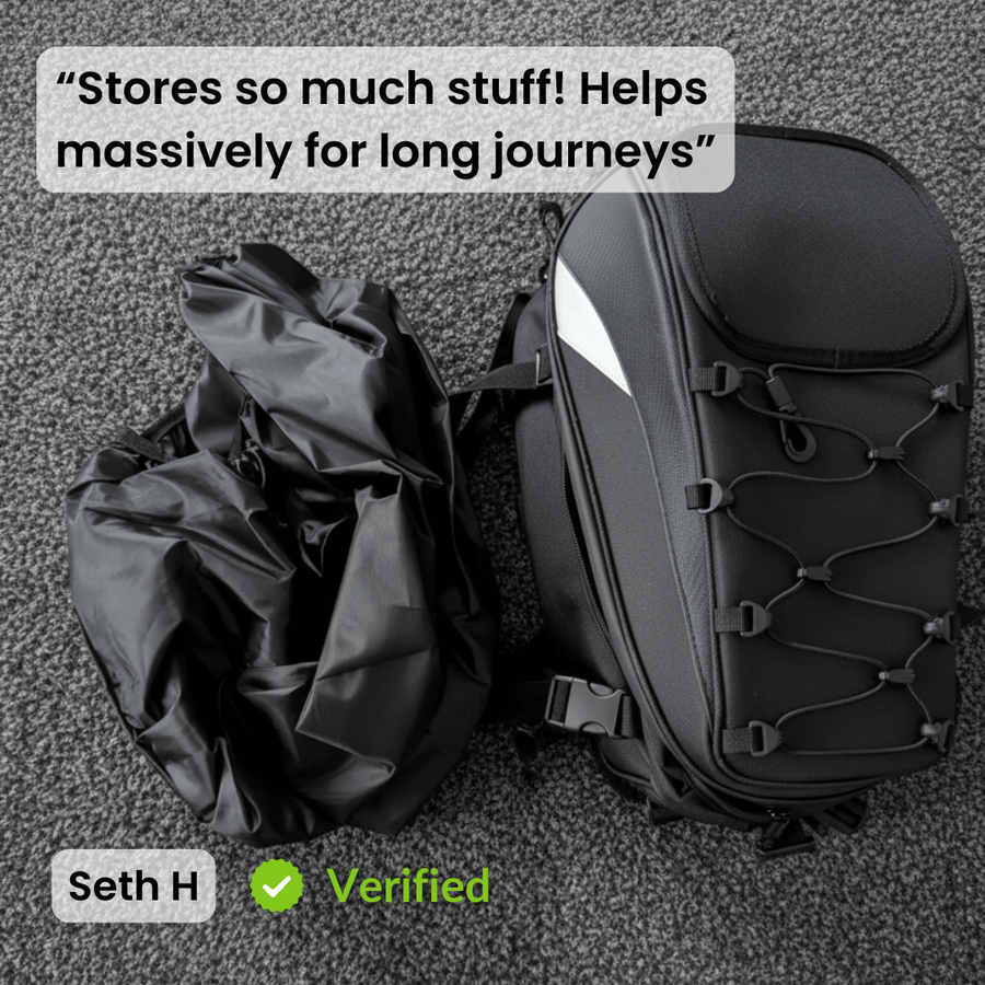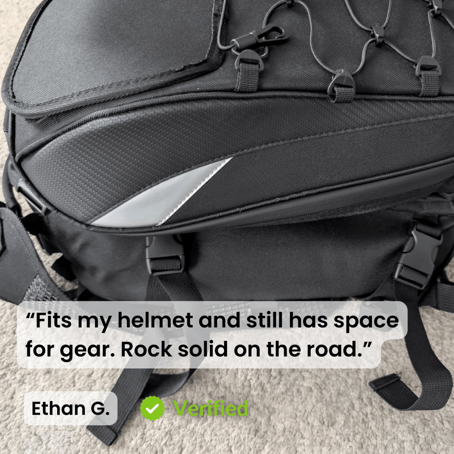 "Perfect for weekend trips. Easily fits my helmet and jacket with room to spare. Way more convenient than strapping a backpack on my shoulders"